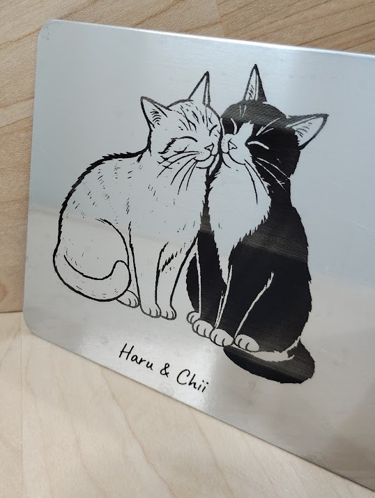 ステンレスやアルミなどの金属板にイラストや文字をレーザー彫刻できます。 当製作所の看板をステンレスプレートで制作してみました。 (300㎜×100㎜×15㎜/SUS304) ステンレスは耐久性と高級感がありますので、看板や表札にとても向いています。 お気に入りの写真をイラストに変換して彫刻すれば、一般的な印刷物にはない、 アート作品のような存在感を生み出します。